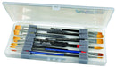 This transparent plastic box features three brush-holder springs in its base to protect delicate brushes from damage. 14-3/16" wide by 6-1/4" deep by 1-3/16" high with a snap latch.
