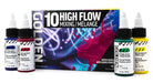 The 10-Color High Flow Mixing Set contains ten colors in 1 fl. oz./30ml bottles. It includes benzimidazolone yellow light, benzimidazolone yellow medium, naphthol red light, quinacridone magenta, phthalo blue (red shade), phthalo blue (green shade), phthalo green (blue shade), phthalo green (yellow shade), carbon black and titanium white. Mixing is easy with the intuitive split primary method of the Color Mixing Sets. A warm and cool choice of each primary color in addition to other key colors allows the artist to mix an extensive range of colors.